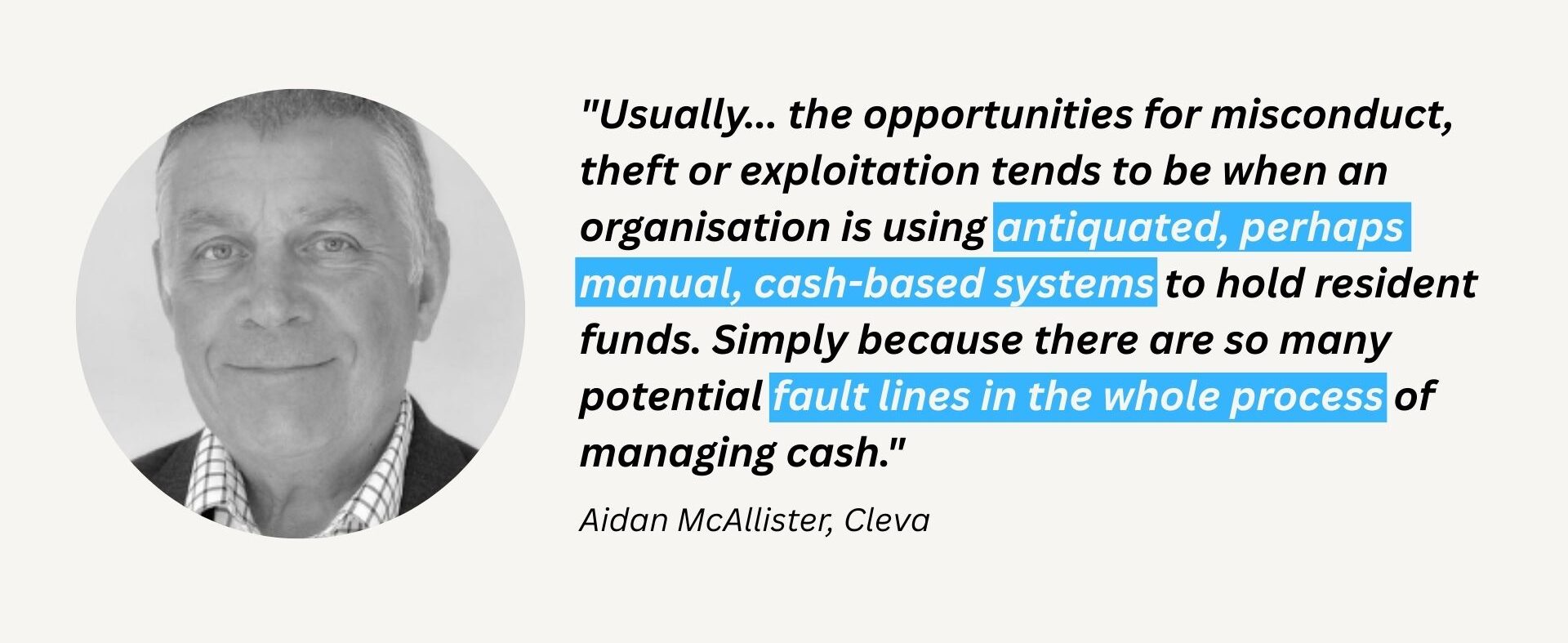 Every day, care providers grapple with managing resident funds. As a result of short-term convenience and time pressures, this task is often executed through manual cash books, spreadsheets, and physical lockboxes. This process is not only time-consuming but fundamentally unsafe.